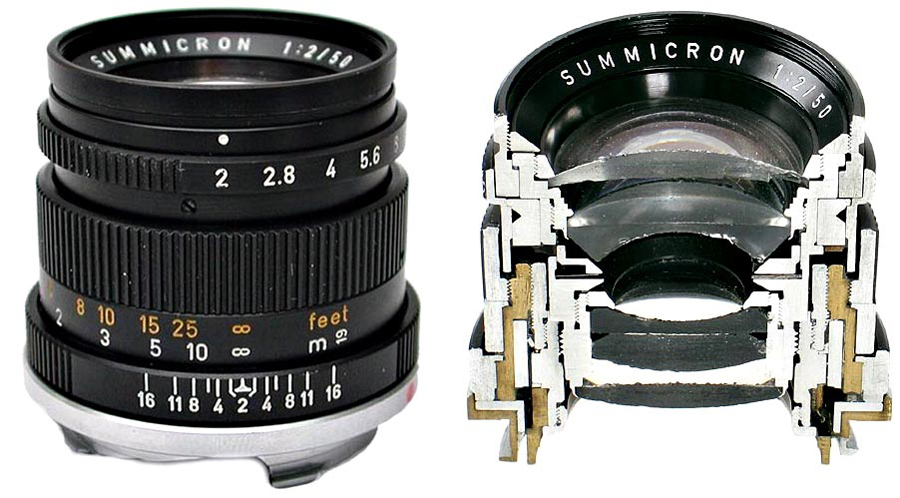 今回扱う「Summicron f/2シリーズ」の極意は、上の光学系構成図の第1群前玉と第2群の2つの2枚貼り合わせレンズを接着せずに「そのまま単独使用してしまった光学設計概念」であると指摘できます。