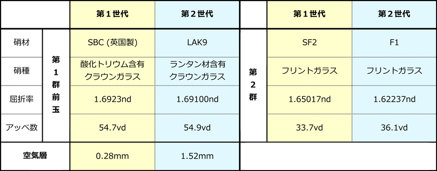 ここで注目すべき要素の1つ目は、硝材「LAK9」の採用であり、既に「酸化トリウム」含有を廃止しランタン材含有タイプ開発が終わっていたことを表しています。さらに光学設計の基本概念がガウス型であることを語り、その基本的構成を踏襲しながらも、その中で「空気レンズ層」を活用してきた点を強調していることが窺えます。