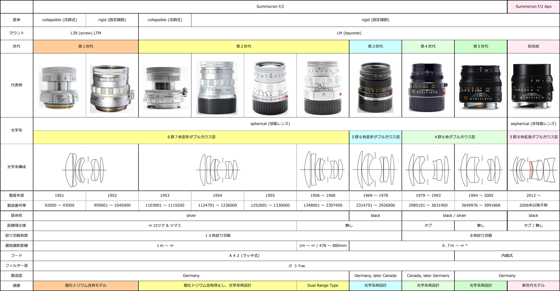なお、今回扱った個体のモデルバリエーションが、そもそも「Summicron f/2シリーズ」の初のオーバーホール/修理個体なので、上の一覧に掲示しているその他のモデルバリエーションについては「現状、光学系構成図も含め一時的なモノ」であることは、必然的な注釈となります(汗)