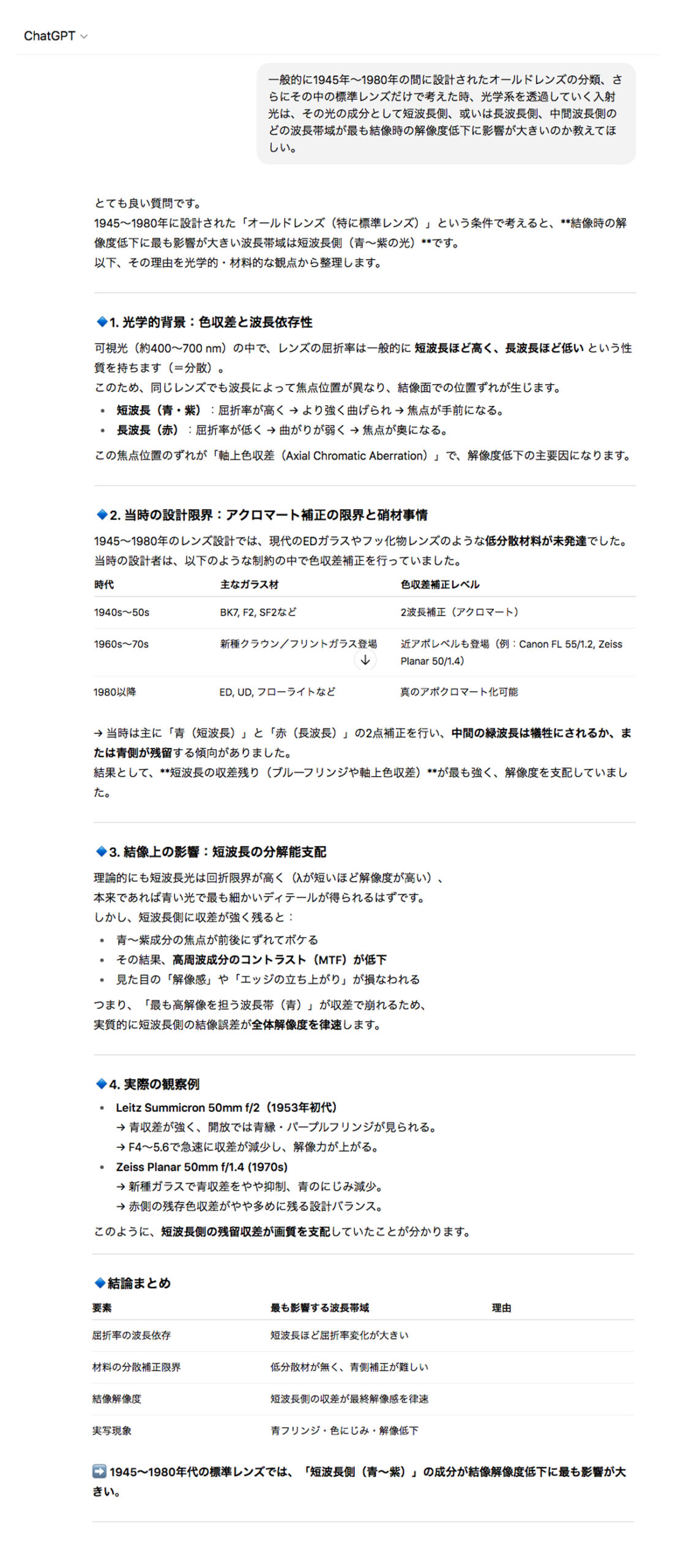 この欠けている波長:についても補正できているレンズを指して「アポクロマートレンズ」と呼びますね (つまり光の三原色について色ズレが生じていないレンズ)。