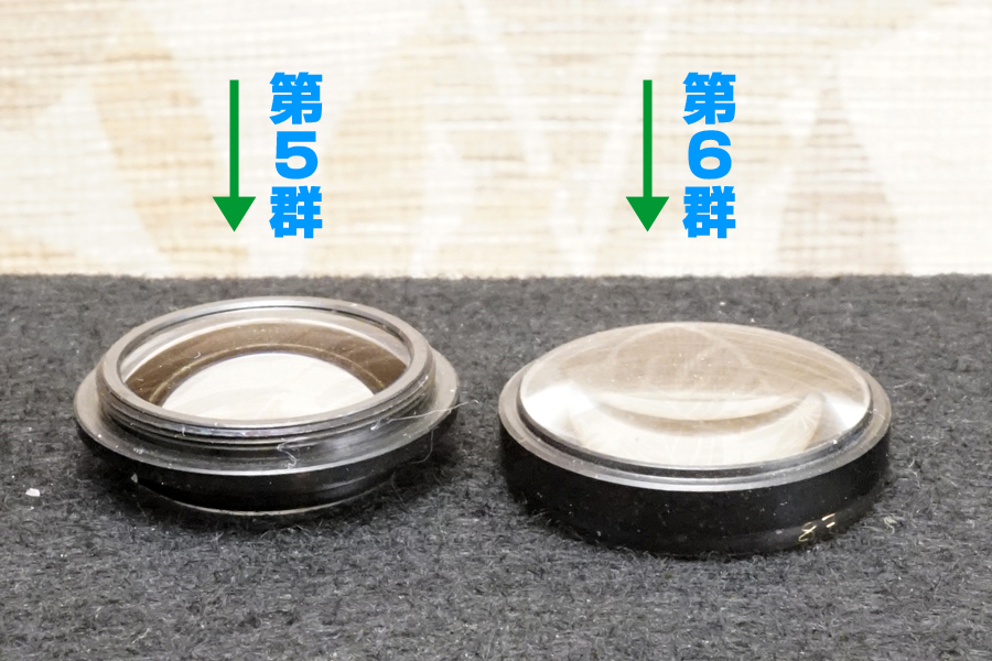 ↑後群側も同じですが、一部光学系第5群の2枚貼り合わせレンズ、構成5枚目の蒸着コーティング層も同様剥がれかかっています。中心部が残ってくれたので、そのまま仕上げています。