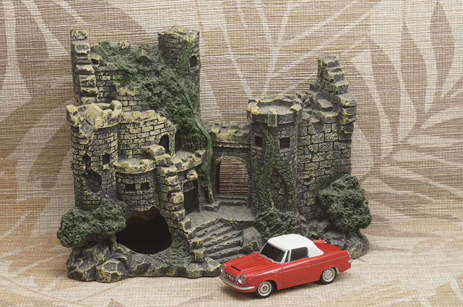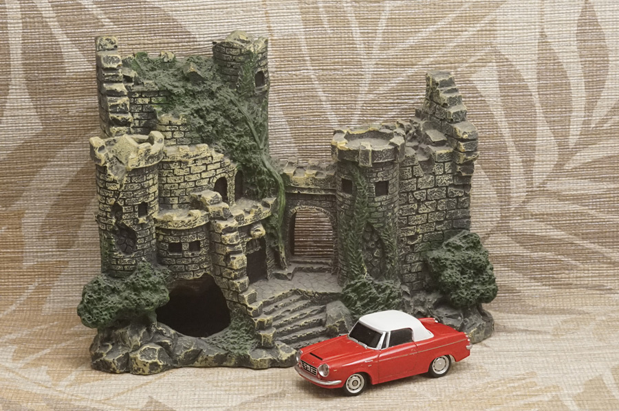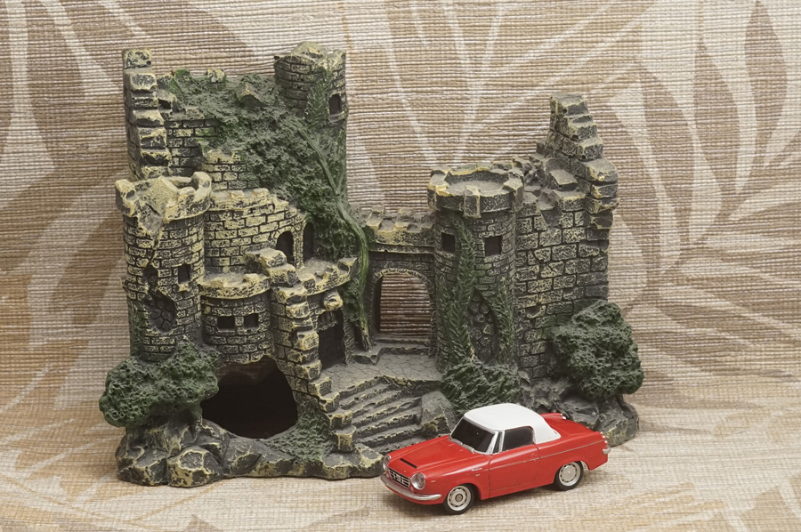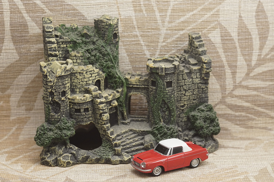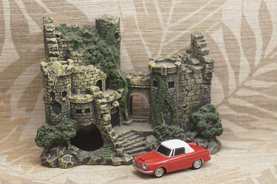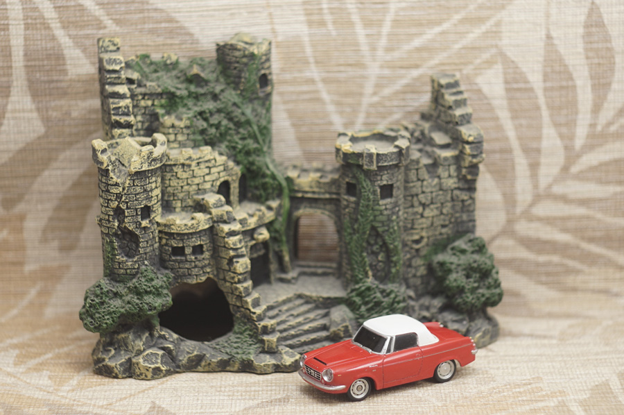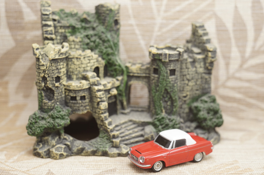 ↑当レンズによる最短撮影距離1m付近での開放実写が1枚目の写真です。ピントはミニカーの手前側ヘッドライトの本当に「球部分」にしかピントが合っていません (このミニカーはラジコンカーなのでヘッドライトが点灯します)。カメラボディ側オート・ホワイト・バランス設定はOFFです。