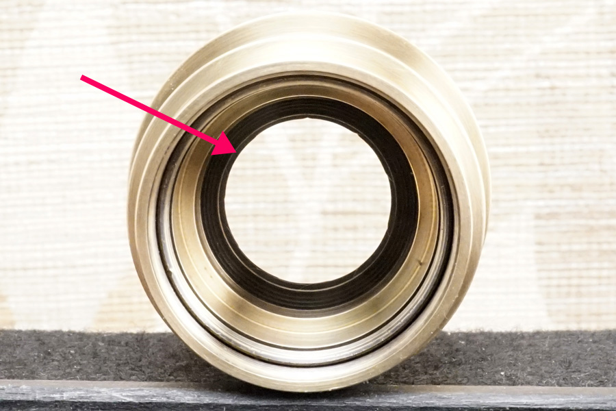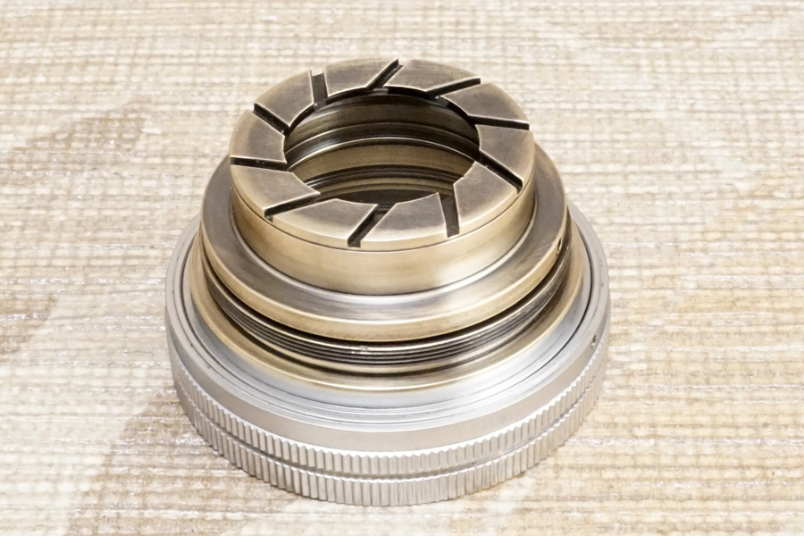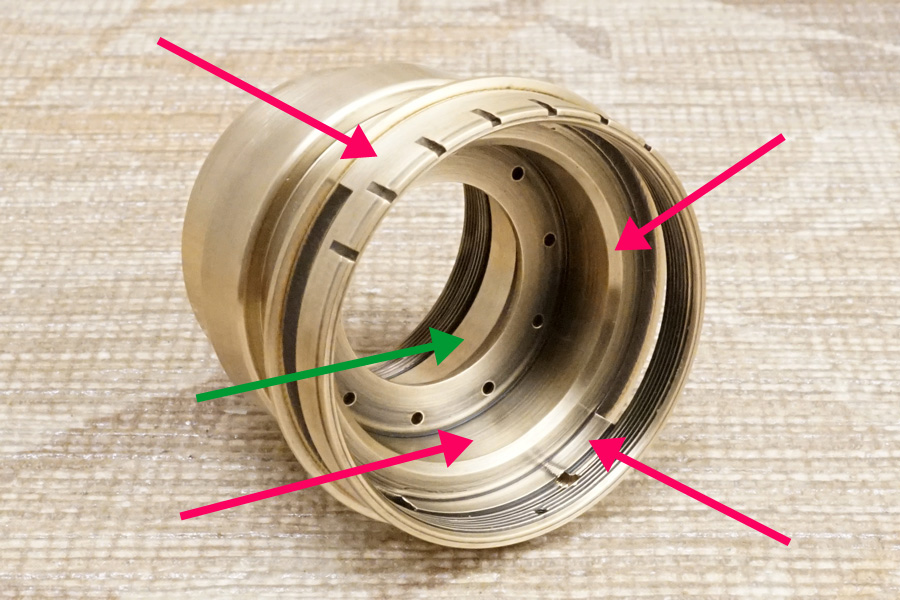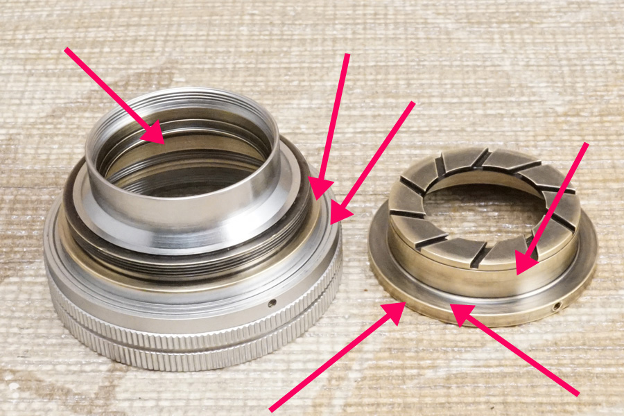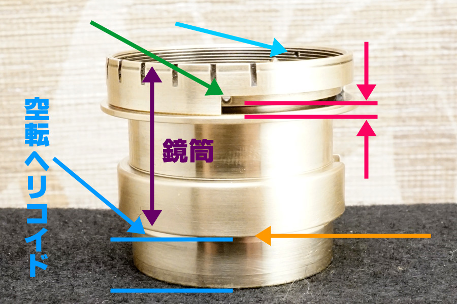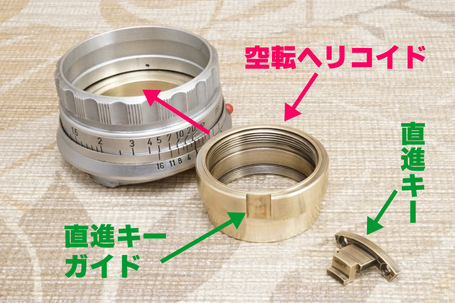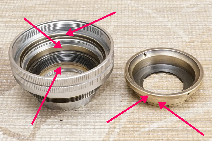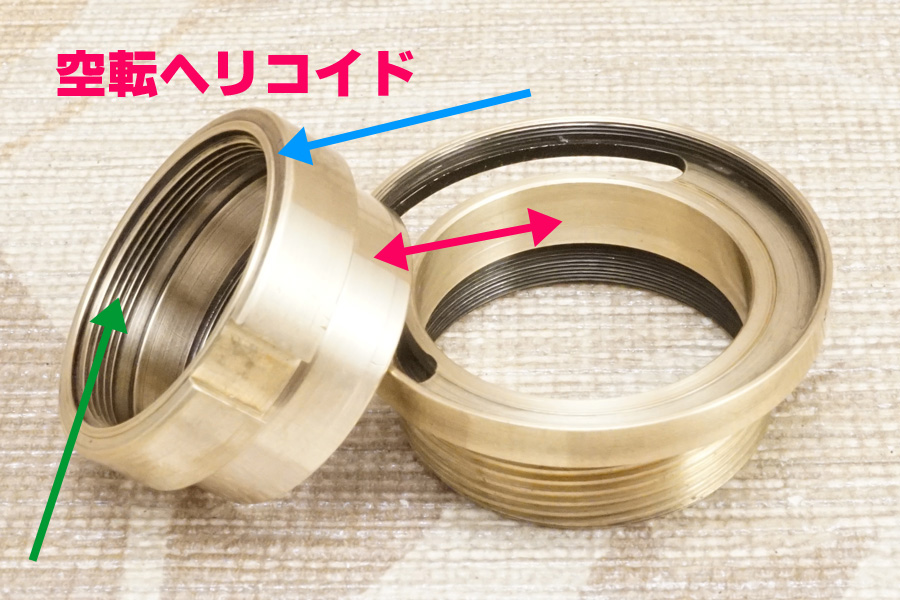 さらにもう1つ付け加えるなら、この空転ヘリコイドを後から 空転ヘリコイド締め付け固定環 (黄銅材) を使って締め付け固定すると言うことは「最後まで締め付け固定しなければ完全固定できない」のは道理なので、その時にマチ/隙間/遊びを与えてしまうと、空転ヘリコイドヘリコイドは一切固定できずに廻ってしまう、或いは下手すれば鏡胴「前部」まるごと落下することになります(怖)