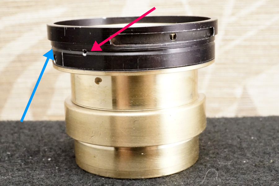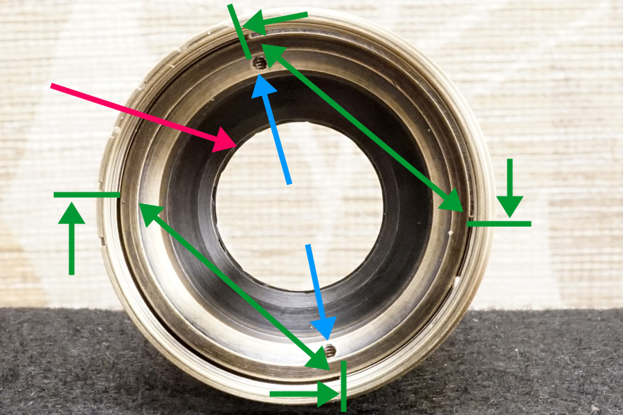 また当初バラす前時点ではブルー色ラインの位置に一直線上に互いの基準「・と▲」マーカーが来ていたのは「ガタつきが起きるのを承知で固定していたから」と説明でき、鏡胴「前部」のガタつきを解消すると、ご覧のようにブルー色の矢印 (水平のほう) 分の距離で、ピタリと合致していないことになります。