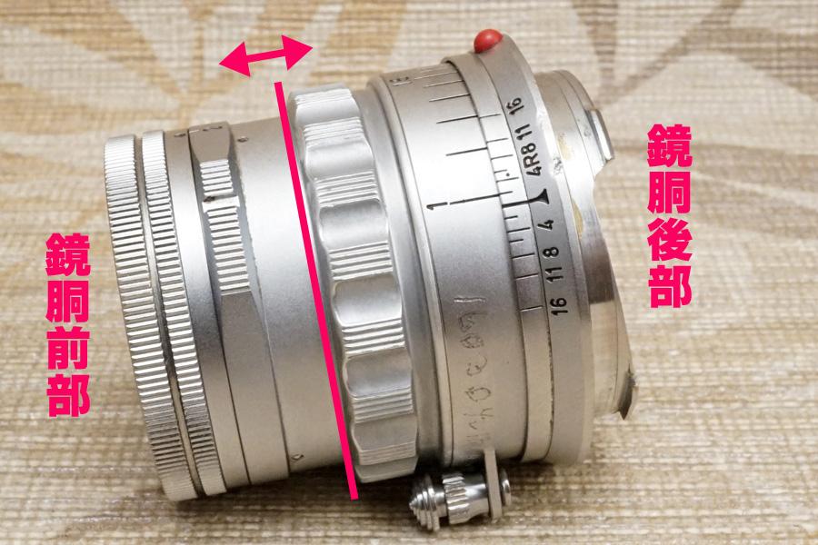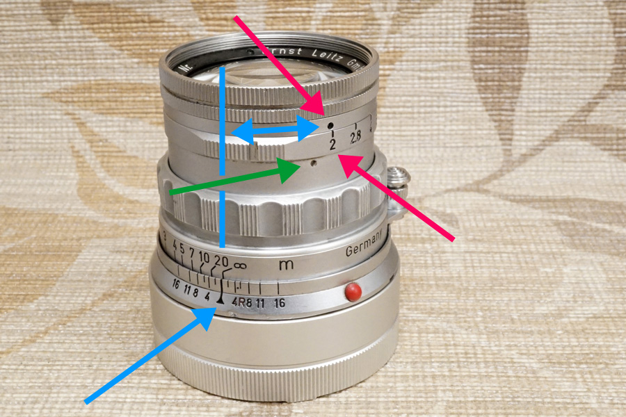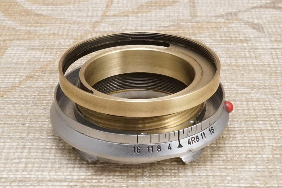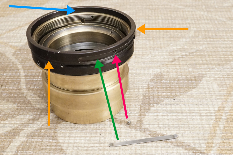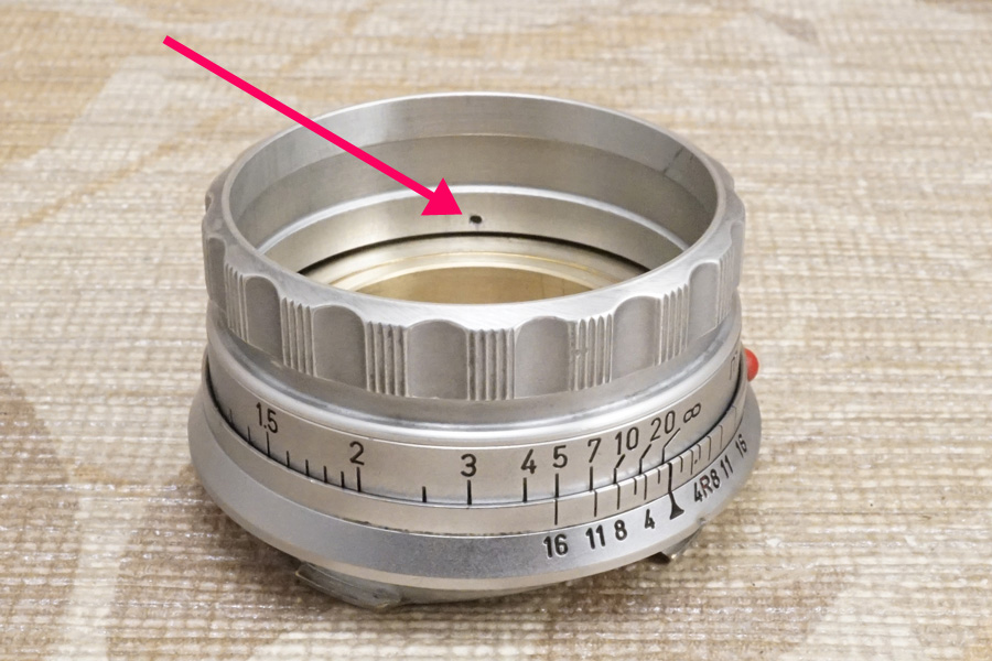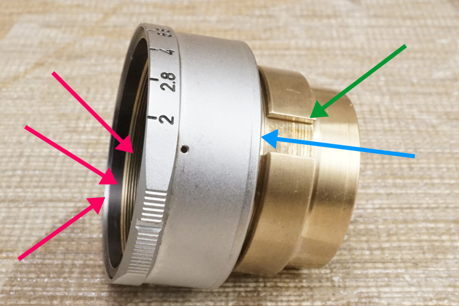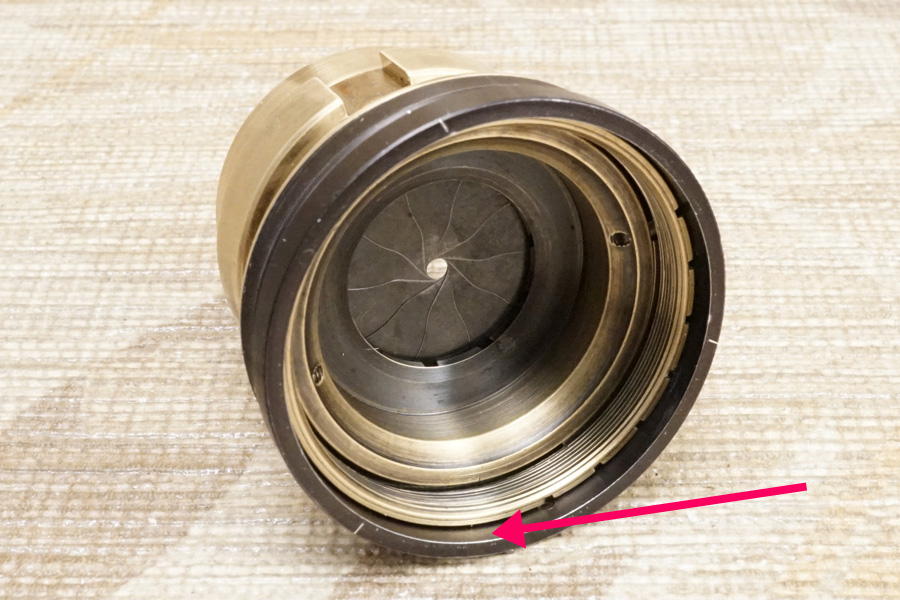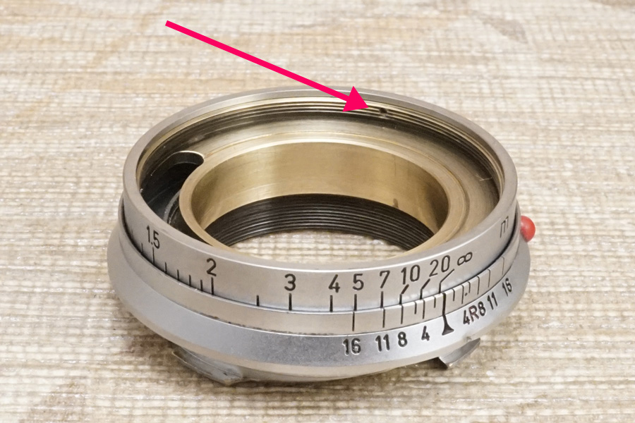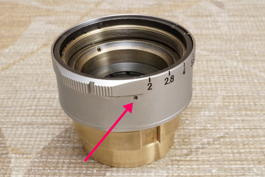 結局赤色矢印で指し示している箇所の「・」と、絞り値の位置をピタリと合わせようにも、そもそも光学系前群格納筒のネジ込みが終端が先まで回る為、ご覧のように (当初バラす前時点から変化しませんが) ピタリと位置が合っていません (ネジ込みが回りすぎている)。