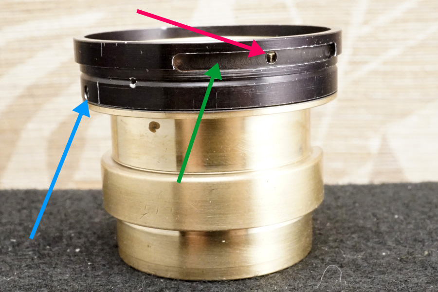 従って一直線上に並ぶように仕向けず (それを無視して) 組み上げた結果、現状発生したガタつきは消えています・・なお、それに際し、空転ヘリコイドと鏡筒との間に「当方で用意したシム環」を挟んで仕上げています。
