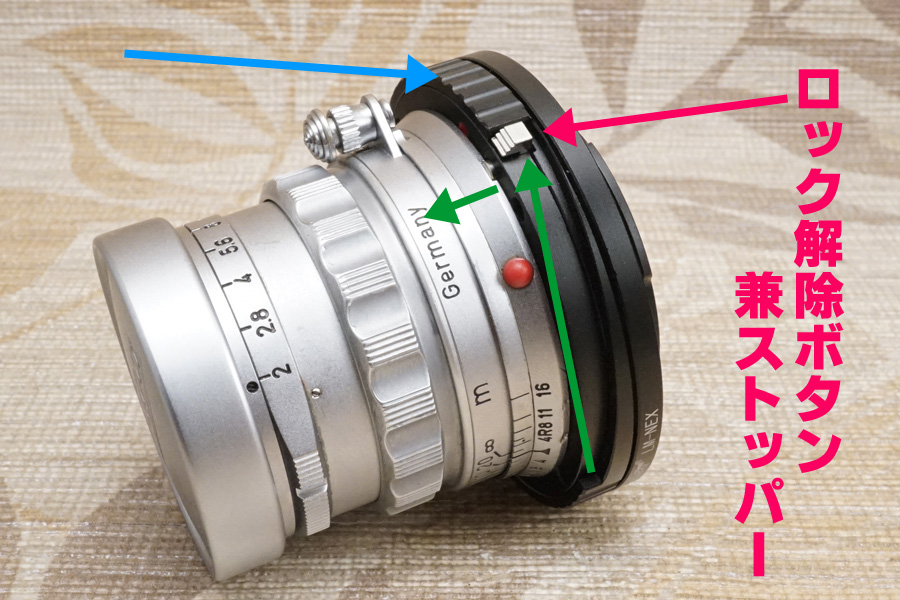 ↑ロック解除ボタン兼ストッパー (赤色矢印) が用意されていますが (小さすぎて非常に使いにくい) ブルー色の矢印のようにマクロヘリコイドの収納時には、このマウントアダプタの製品全高はマウント規格規定値の範囲に収まり、当然ながら無限遠位置もピタリと合焦しています。