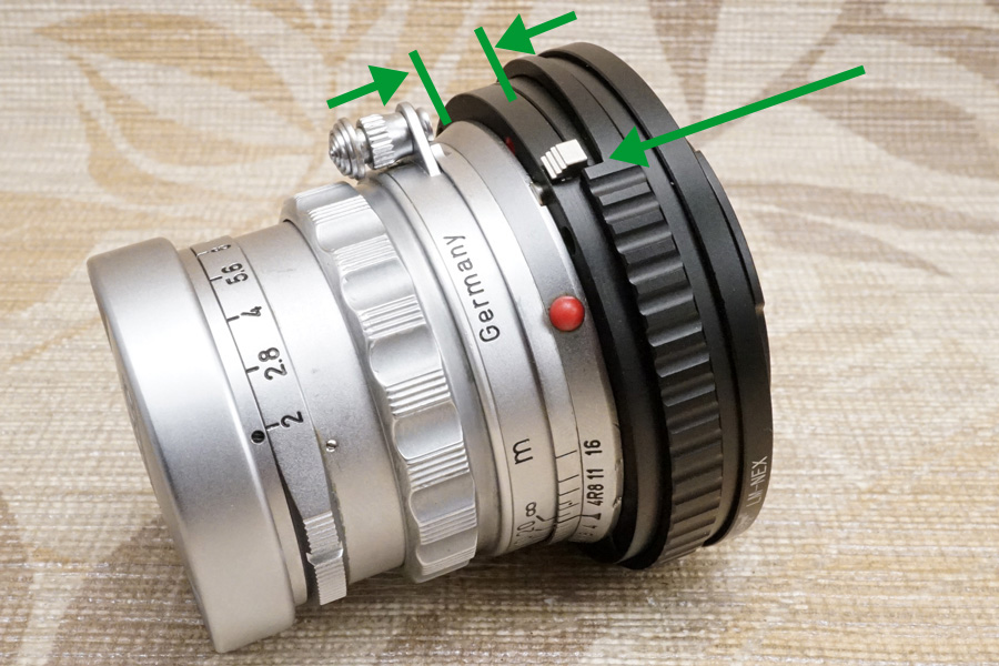 マクロヘリコイドのローレット (滑り止め) をグリーン色の矢印のように回すと、最大で5㎜分繰り出される為、オールドレンズ側の仕様諸元値を超えて近接撮影が実現される仕組みです。