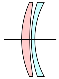 上記のガウス理論では、ガウス氏提案の並びの中で、高屈折率/低アッベ数の凸レンズ系 色付クラウンガラスの次に、低屈折率/高アッベ数の凹メニスカスレンズである 色付フリントガラスの2つの光学硝子レンズが『近接配置』されることを以て完成します。