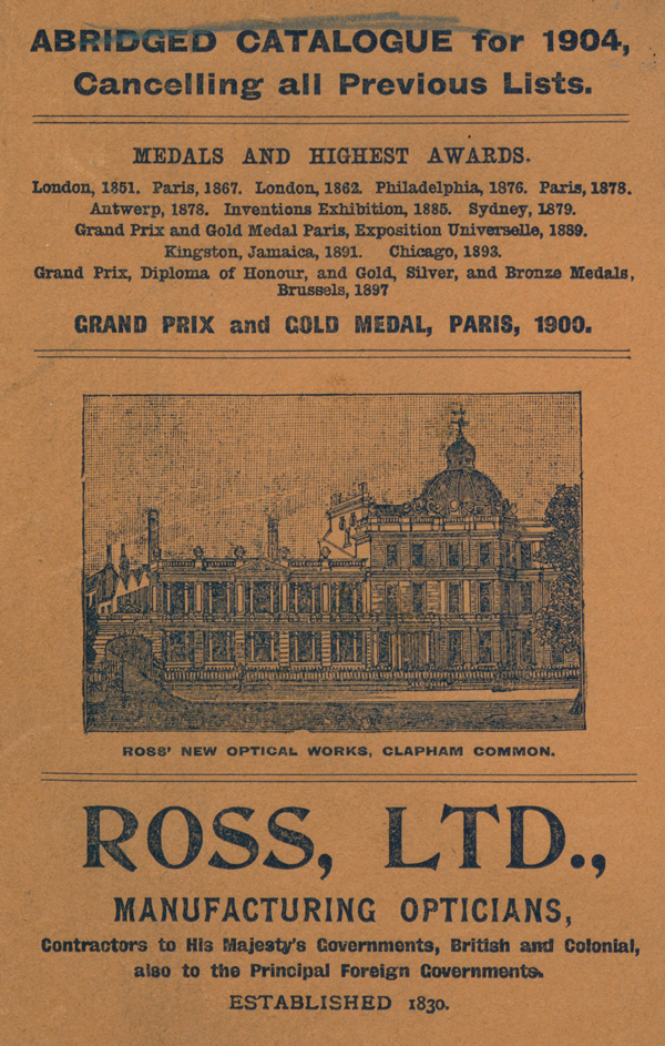 創設者は「Andrew Ross (アンドリュー・ロス)」氏であり、1829年にロンドンのウィグモアー・ストリートに「Ross & Co, Manufacturing Opticians」を開設します。写真向けレンズの開発と製産は1840年からスタートしています (当時の製品にはA. Ross, London の刻印が施されていた)。