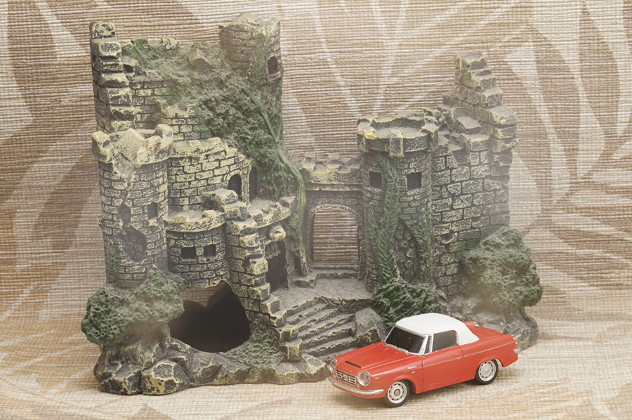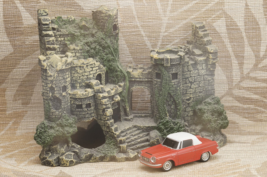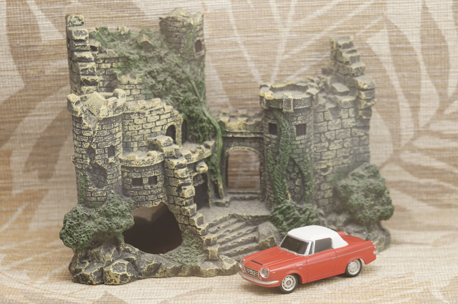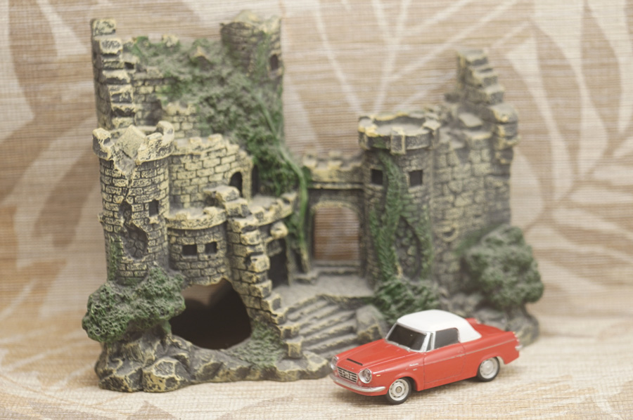 ↑当レンズによる最短撮影距離1m付近での開放実写です。ピントはミニカーの手前側ヘッドライトの本当に「球部分」にしかピントが合っていません (このミニカーはラジコンカーなのでヘッドライトが点灯します)。カメラボディ側オート・ホワイト・バランス設定はOFFです。