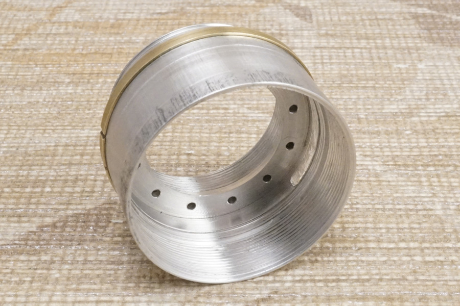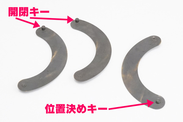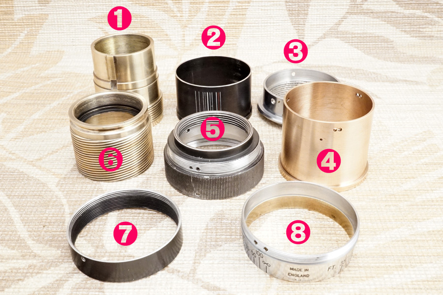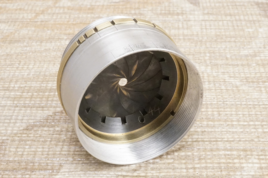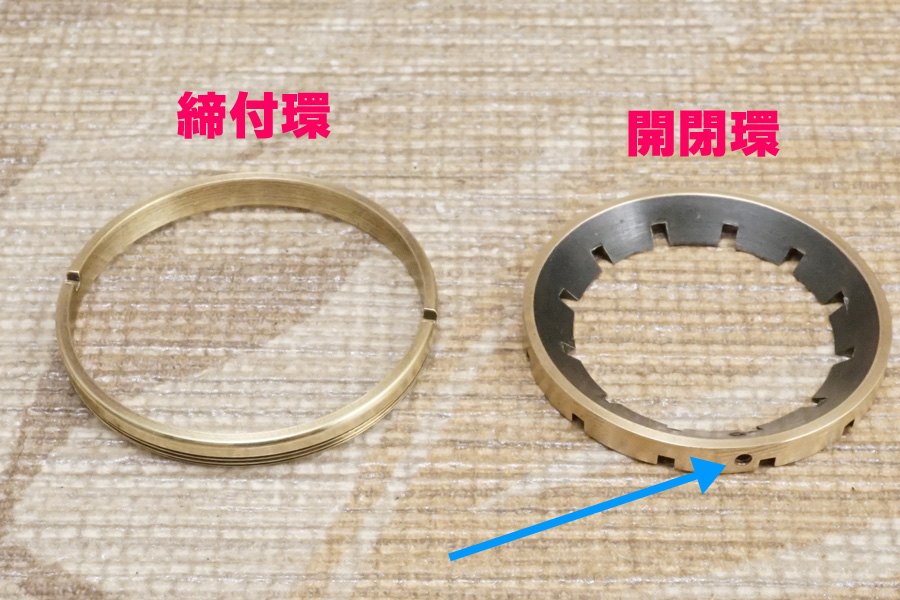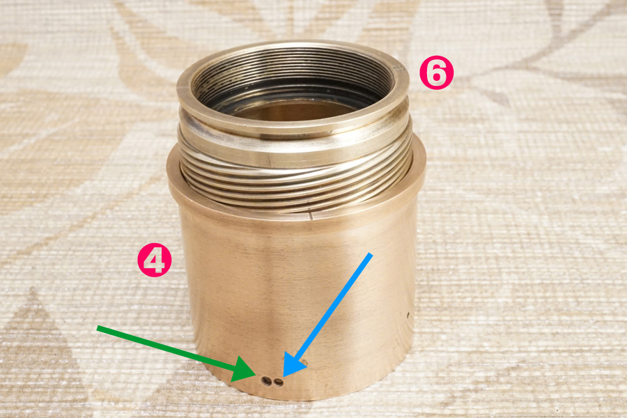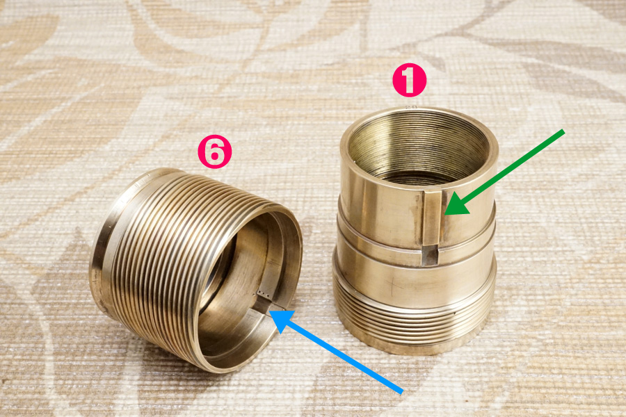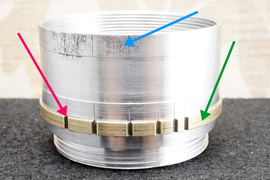 ↑前のほうで解説してきた構成パーツは多くが黄銅材や真鍮材/ブラス材でしたが、上のパーツはアルミ合金材です (❼と❺)。さらにそれらをイモネジを使って締め付け固定する先が、まさに黄銅材です。