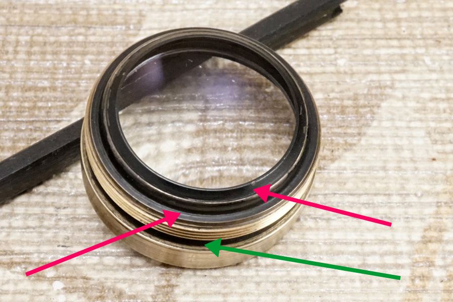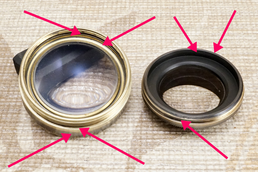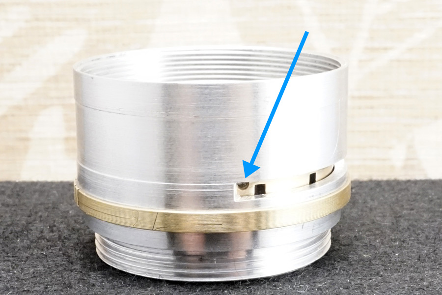 しかもヘリコイド群格納筒の麓には、グリーン色の矢印とブルー色の矢印で指し示している箇所に2つのネジ穴が研削されています。このうちのどちらかが「ごまかしの整備」でドリル穴あけされたネジ穴で、要はヘリコイドの固定位置を強制的にズラして∞刻印位置を合わせようとした所為がモロバレします(笑)