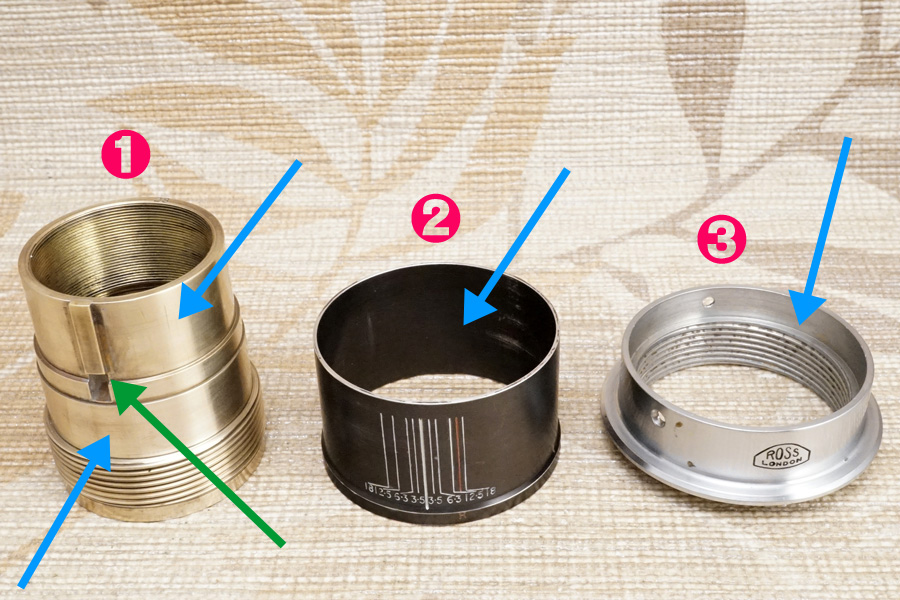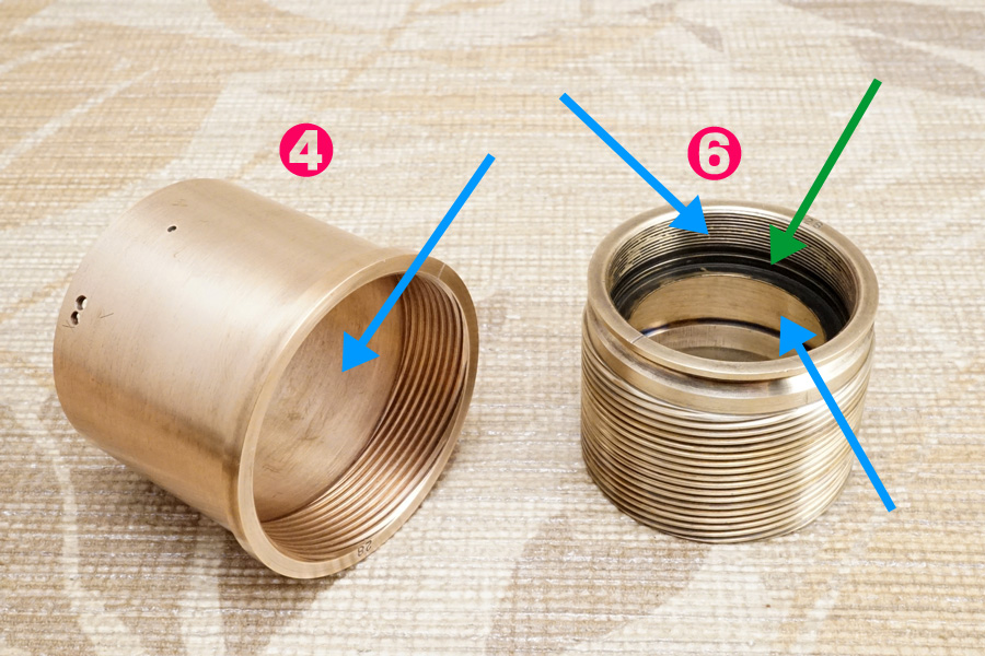 ↑❶ 距離計連動ヘリコイドの途中に用意してある「直進キー」は (グリーン色の矢印)、❻ のヘリコイドオス側の内側に用意してある「直進キーガイド」にブルー色の矢印のように刺さり、スライドして動きます。