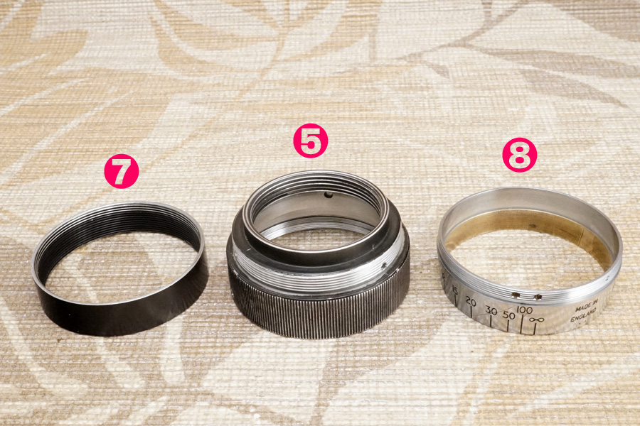 ↑❸ マウント部に、❶ 距離計連動ヘリコイドをネジ込みますが、この時に当然ながら、無限遠位置のアタリを付けた正しいポジションでネジ込みます。このモデルは全部で3箇所のネジ込み位置がある為、さすがにここをミスると最後に無限遠が出ず (合焦せず) 再びバラしてここまで戻るハメに陥ります。