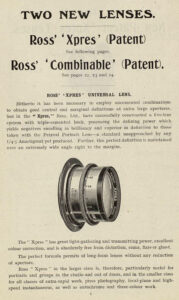 この光学設計は製品化されており、既に1914年の製品カタログに「ROSS’ “Xpres” (Patent)」と表記され掲載しているのです。まさに「Patent」の文字が示すように特許出願した上で製品化していたことの査証です (モデル銘はエクスプレスと発音します)。