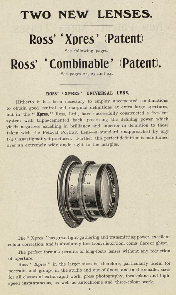 この時のカタログの記事を和訳すると「このレンズシステムは、ペッツバールポートレートレンズで撮影したものよりも輝度が高く、優れた解像力を持つネガを生み出す力を備えており、これまでに製造された1/4-3アナスティグマート (テッサー型を指す) では達生できなかった基準です。さらに、この完璧な解像力は、極めて広角な範囲から周辺まで維持されます」とその自信の程を語っており、さらに「Xpresは優れた集光力と透過力、優れた色補正能力を備え、歪み、コマ収差、フレア、ゴーストの発生を一切抑えています。完璧な配合により、絞りを小さくすることなく長焦点レンズを使用できます。そのため、大きいサイズのROSS Xpresは、スタジオ撮影や屋外でのポートレートやグループ撮影に特に役立ちます。また、小さいサイズのROSS Xpresは、あらゆるクラスの超速写、報道写真、フォーカルプレーンおよび光束インスタント写真、オートクローム、3色写真に最適です」と、その有用性を語っています。