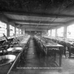 ㊧写真はその頃の工場棟の内景で、まさに光学ガラスレンズを研磨する機械設備が備えられていたことが分かります (左側の円形の機械設備が研磨機)。