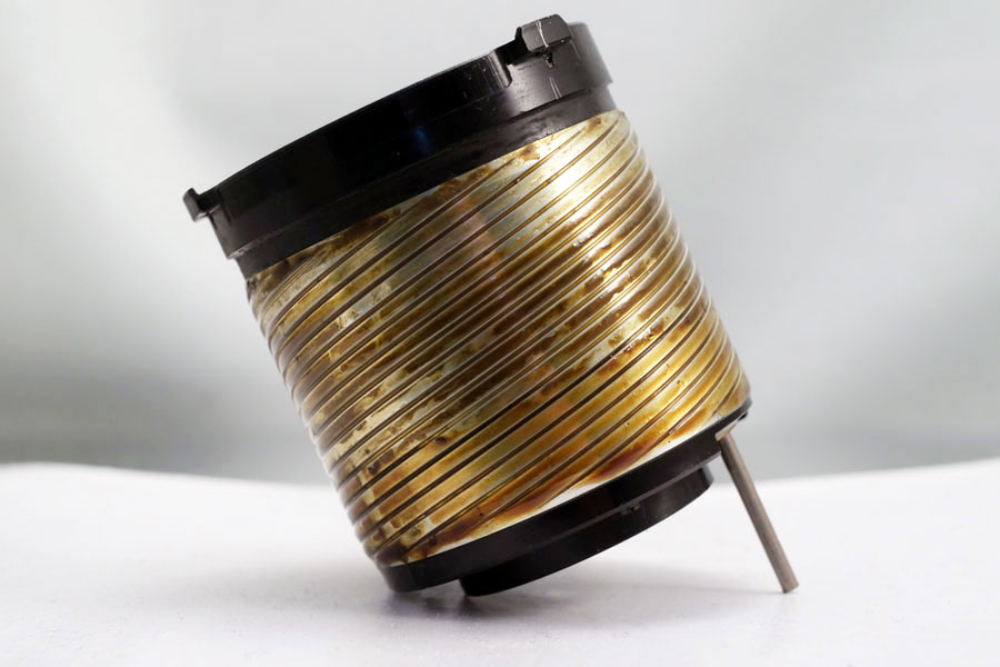 ↑多くの場合で、製産時点に塗られていたヘリコイドグリースは「黄褐色系グリース」です。経年劣化進行に伴い、上の写真のように液化した揮発油成分の影響から粘度を失っていきます。