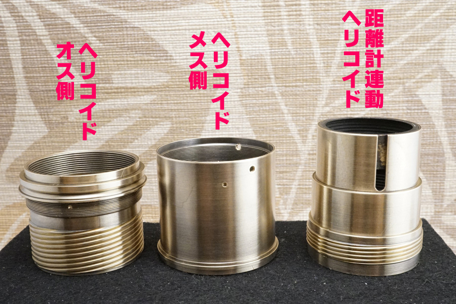 ヘリコイドのオスメスの条ネジ山も含め、ご覧のとおり仕上がりますから、ここに塗布するヘリコイドグリースは「皆さんが期待されるトルク感へと仕向けるグリース種別と粘性をチョイスして組み上げられる」ワケですね(笑)