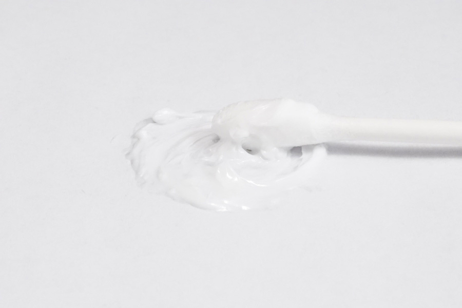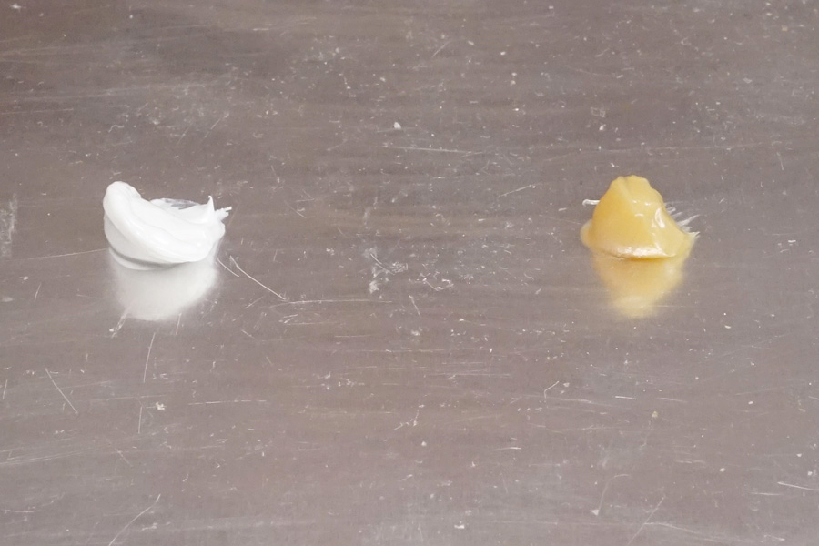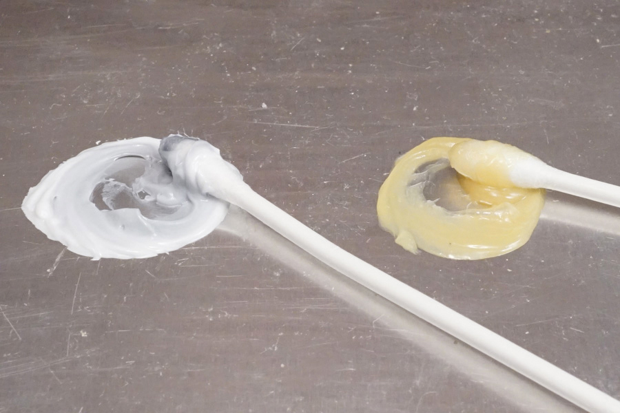 ↑上の写真は、まさにその検証として、当方が所有する一部の「白色系グリース㊧」と「黄褐色系グリース㊨」を使って、厚さ2㎜のアルミ板に置いて、綿棒を使って実験してみました。