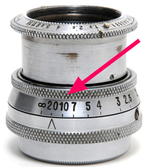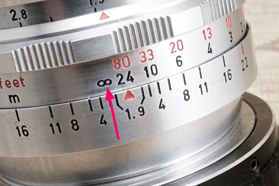 ↑上の写真は実際に当方所有マウントアダプタにて無限遠合焦を確認できた位置を撮影しています。ご覧のように距離指標値の「24m」の中央あたりで合焦しています。また∞刻印位置の突き当て停止位置も、赤色矢印のように微調整して詰めていますから、当初の∞刻印の右丸位置から僅かに中心寄りに微調整済みです。