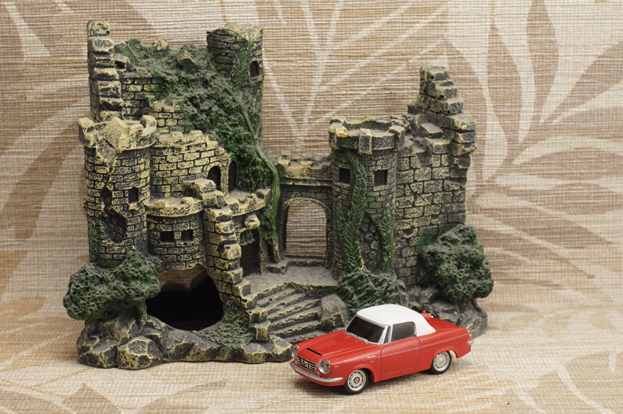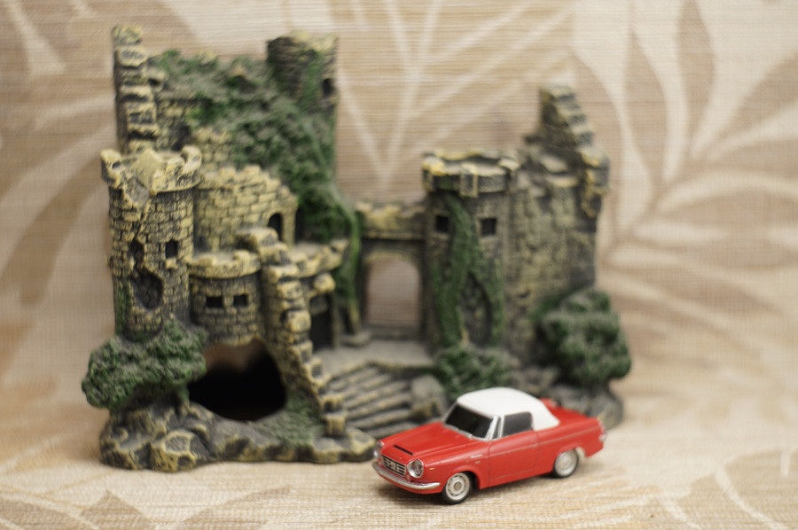 ↑当レンズによる最短撮影距離60cm付近での開放実写です。ピントはミニカーの手前側ヘッドライトの本当に「球部分」にしかピントが合っていません (このミニカーはラジコンカーなのでヘッドライトが点灯します)。カメラボディ側オート・ホワイト・バランス設定はOFFです。