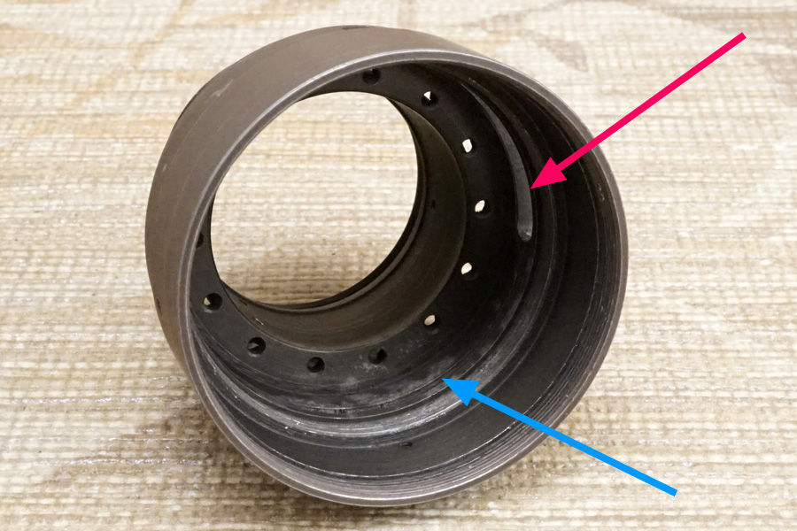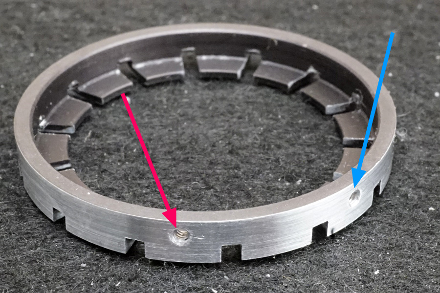 ↑絞り環の内側奥には、ご覧のように「セットキー」と呼ぶ金属棒が両サイドに打ち込まれています。同様前述のとおり、両サイドに用意されている「プリセット絞り値キー」と言う切り欠き/スリット/溝 (赤色矢印) にガシッとハマるので、プリセット絞り値がセットされて、開放〜プリセット絞り値までの間で、絞り環操作できるようになる原理です。