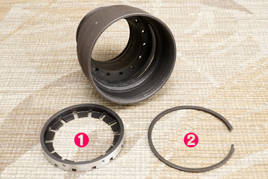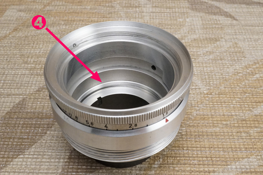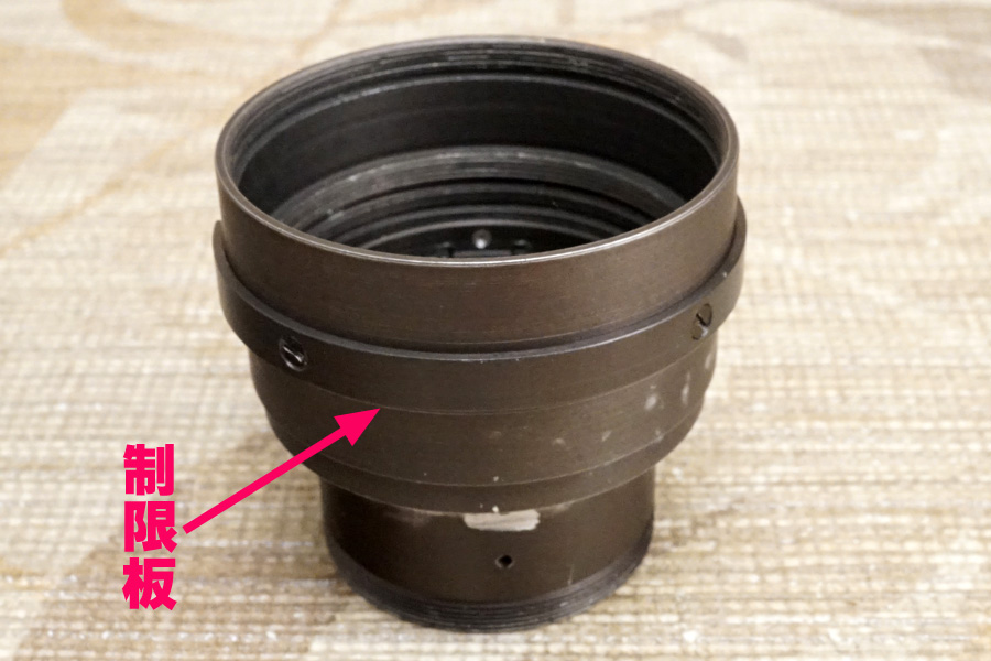 実はこの❹を❸ヘリコイドオス側の最深部にセットしても、ガタガタして固定されませんッ。それこそがこのモデルの製品設計としての「配慮」なのですが、おそらく整備者の多くが気づかないままに組み立てていると考えられます。
