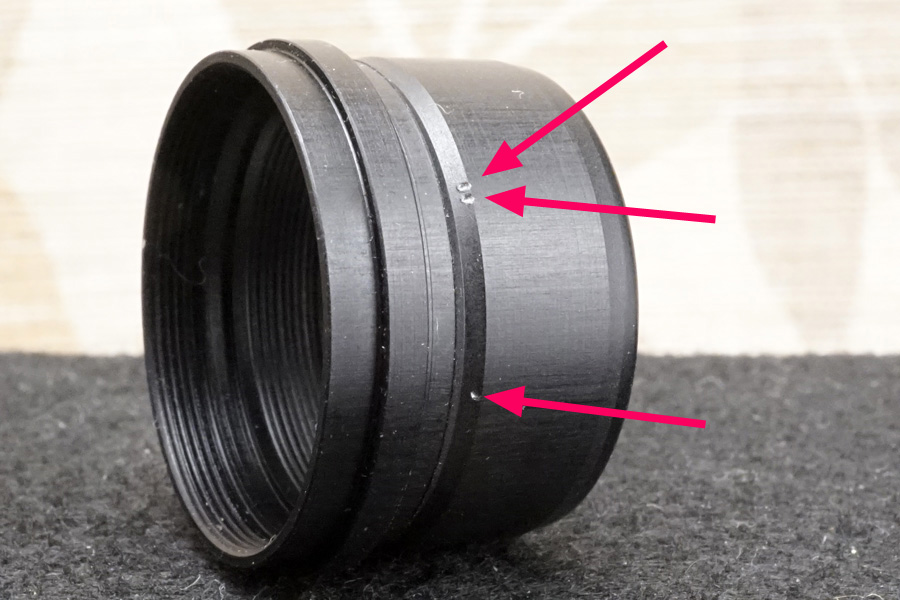↑距離環を基台にネジ込んでいっても、停止する位置は一意で決まっています。つまりネジ山のスタート位置が1つしか用意されていない為、それが意味するのは「無限遠位置の微調整ができない製品設計」と言うことが確実になります。