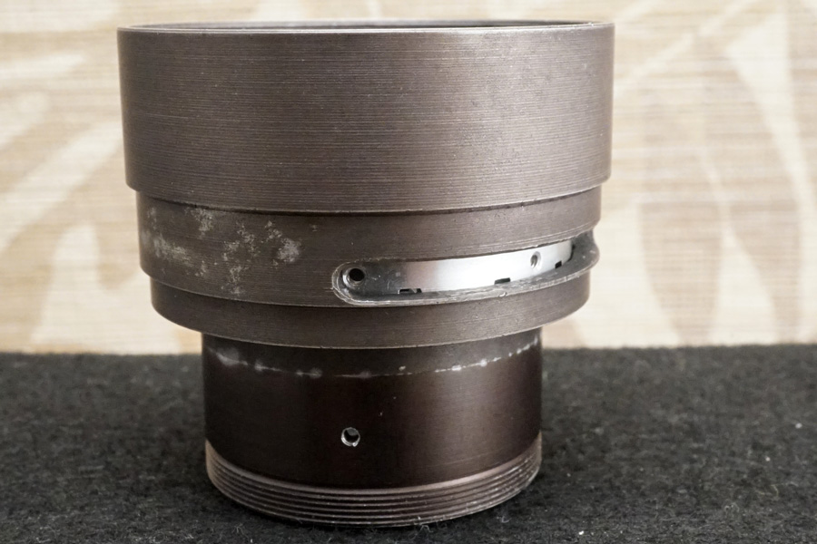 ↑鏡筒に光学系前後群を組み付けたところです。前述のとおり、後群格納箇所には全周に3ヶ所分で、イモネジのネジ穴が用意されていますが、実は単に光学系後群格納筒を落とし込んでからイモネジで締め付け固定しても・・適切な光路長で仕上げられません(笑)