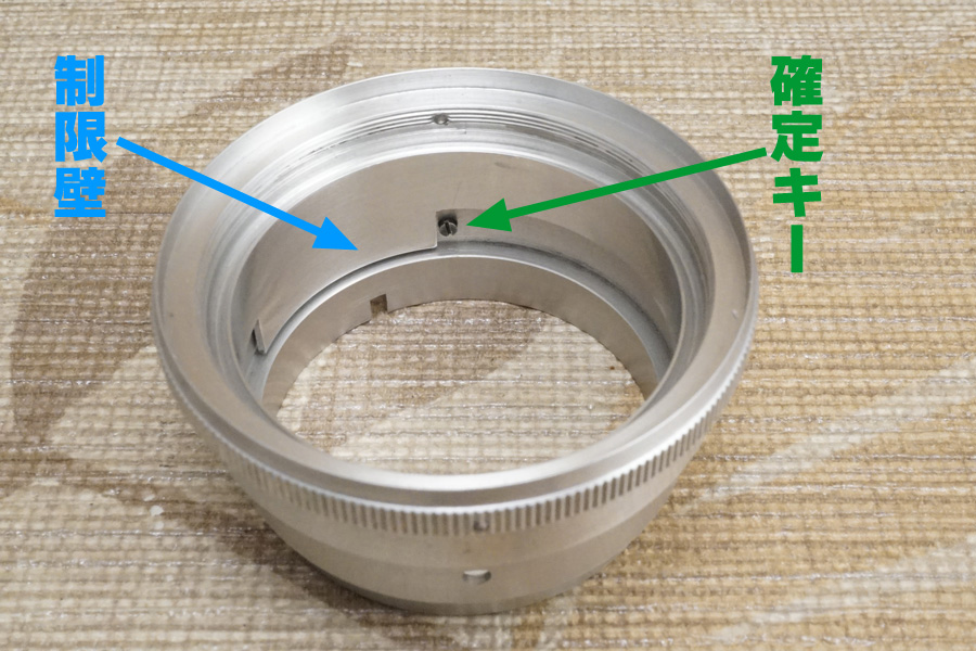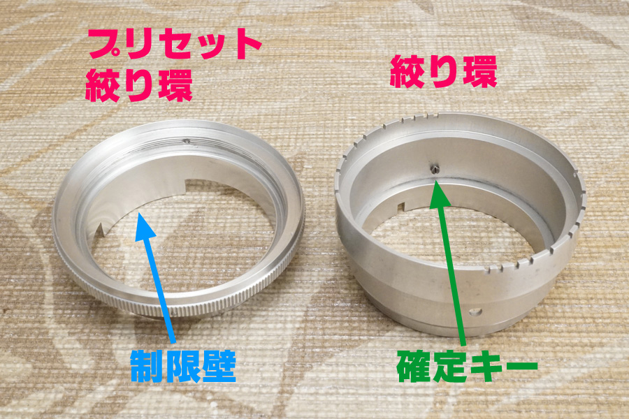 さらに「プリセット絞り環」の下部には「制限壁」と呼ぶ突出が用意されており、それによって絞り環の駆動域が限定されるよう製品設計されています (ブルー色の矢印)。