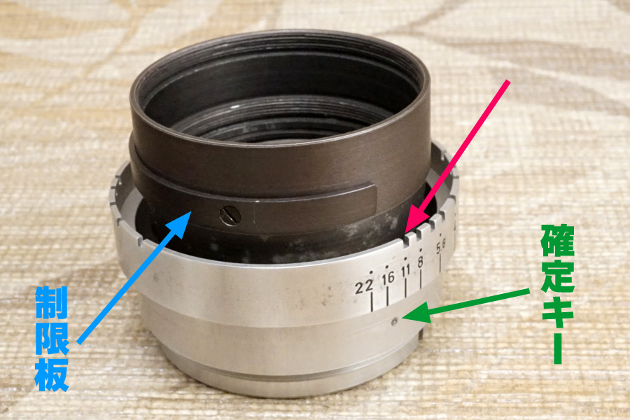 つまりここで「開放〜プリセット絞り値までの間」と駆動域が決まる理由が先に説明していた「確定キー」の存在であり、その際「制限壁」が制限板と確定キーとの間で動けるように仕向けられている機構なのが「プリセット絞り機構」なのです。