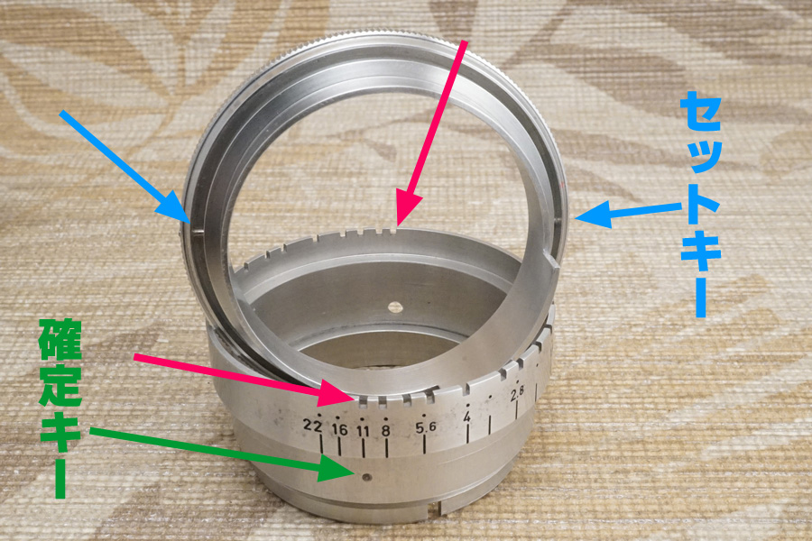 また一方の「絞り環」のほうにも「確定キー」ネジがセットされており、その位置でプリセット絞りの機能の開始位置を「確定する」から必要なネジなのです (グリーン色の矢印)。