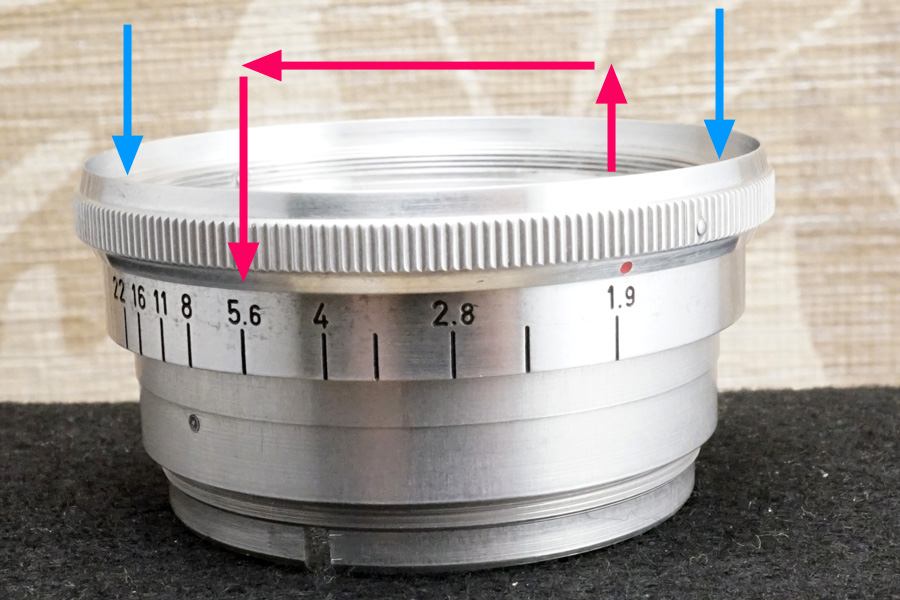 ↑実際にそのプリセット絞り間の操作を理解すれば、自ずと内部構造が浮かび上がるのです。上の写真で赤色矢印の根本がプリセット絞り環であり、ギザギザのジャギーに (平目模様に) 研削されているローレット (滑り止め) の環/リング/輪っかが「絞り環」です。すると一旦直上にこの絞り環を持ち上げてから、設定絞り値 (ここではf/5.6に設定するとして) まで移動させてから、指を離すとブルー色の矢印の方向に強くバネの反発力が働いているので、カチャッと音が聞こえてプリセット絞り値がセットされ (内側の金属棒が溝にハマって)、開放f値「f/1.9 ~ f/5.6の間のみ絞り環操作ができる」つまり絞り羽根が開閉動作する道理になります。