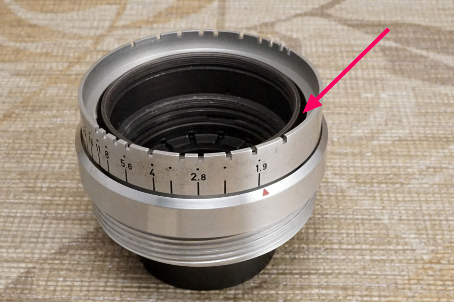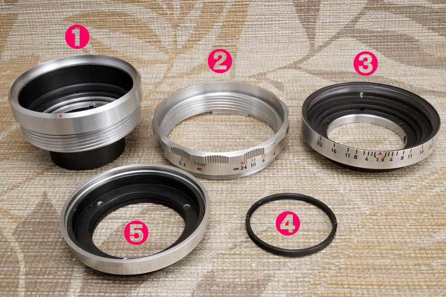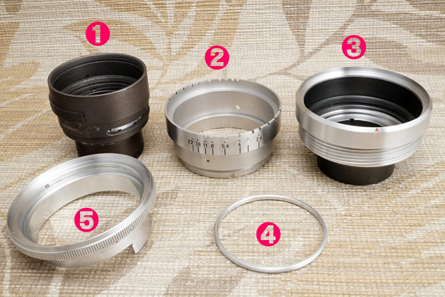 ↑問題になる❹が、このようにサンドイッチされているのです。すると絞り環 (絞り値が刻印されているほうの環/リング/輪っか) が回転駆動する時、いったいどこと接触しているのですか???(笑)