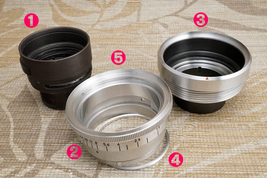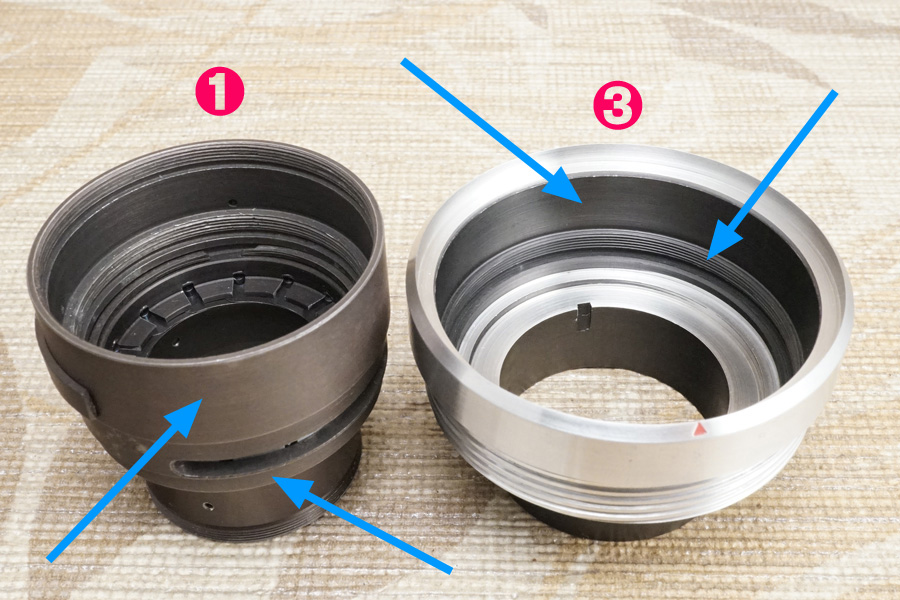 ↑仮組みですが、実際に組み合わせると、こんな感じでセットします。手前の❺と❷と❹が丸ごと、❸のヘリコイドオス側の内部に落とし込まれます。さらにその後から今度は❶が落とし込まれるのです。要はこれら全ての構成パーツが「落とし込みだけで積み重なっていくだけの製品設計」なのです。それを意識的に整備作業時に汲み入れて工程を進めないから、適切な仕上がりに到達し得ません。たったそれだけの話しです。これらのいったい何処にグリースが必要なのか、或いはグリースを塗布してはイケナイのか、そういう話を今しています。