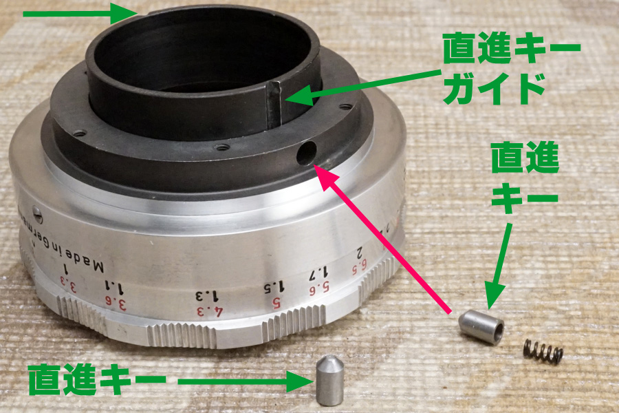 ↑ヘリコイドオス側の裏から飛び出ている両サイドには、ご覧のように「直進キーガイド」と呼ぶ鋭角な谷間になるよう研削されている溝が用意されています。そこに対して外側から両サイドで「直進キー+反発式スプリング」のセットが刺さって、反発式スプリングのチカラによって抑え込むよう製品設計されているのが分かります。
