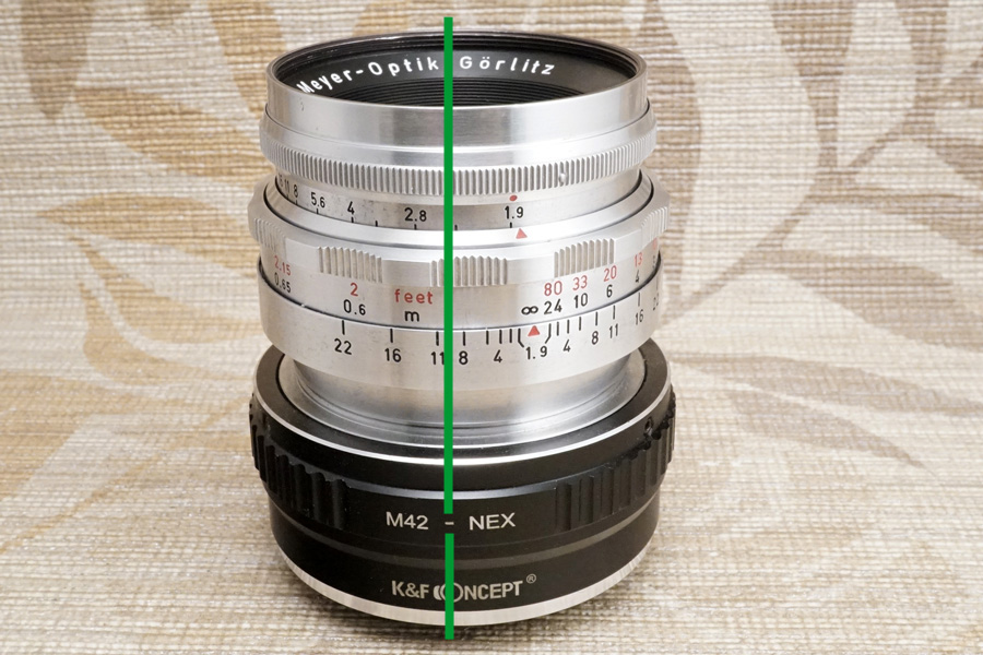 ↑当方所有の基準マウントアダプタ「K&F CONCEPT製 M42 ― NEX マウントアダプタ」に装着した状態で無限遠位置の微調整と確認を行っています。このマウントアダプタの後に登場したオレンジ色のカラーリングが施されているタイプをご使用頂くと、マウントアダプタの製品全高が僅かに異なる為、アンダーインフ状態ギリギリになります。今回のオーバーホール/修理工程では、それを勘案して1目盛り分の許容範囲にオーバーインフ量を詰めていますから、ご留意下さいませ。