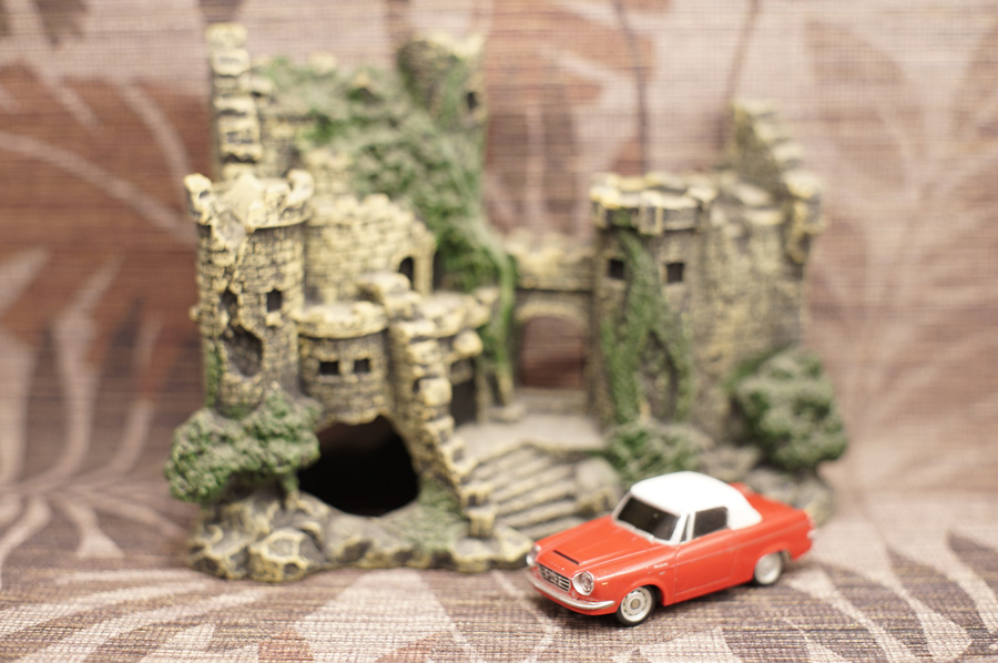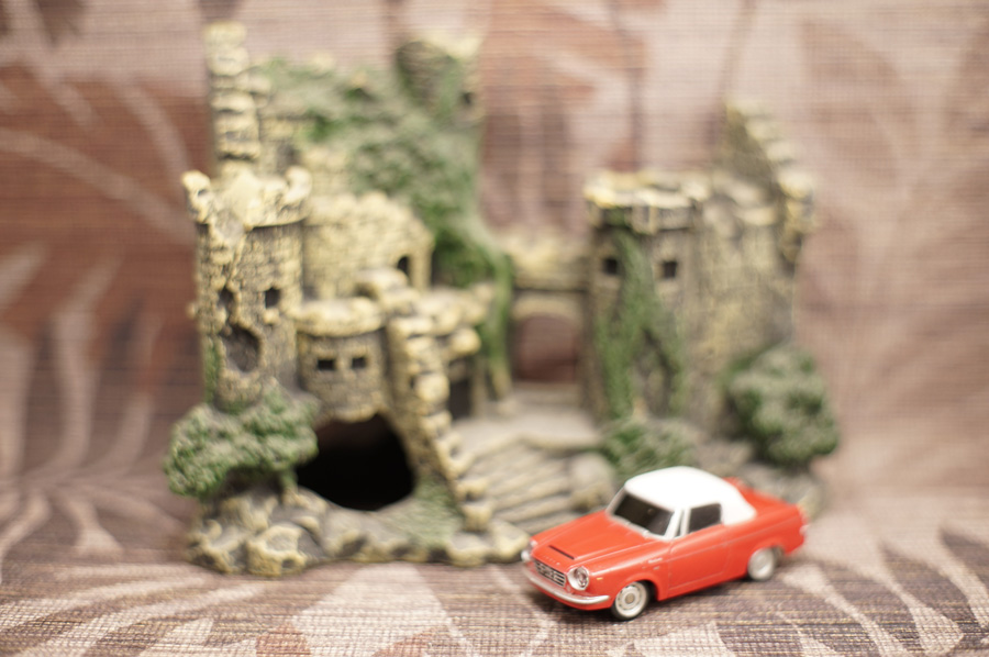 ↑当レンズによる最短撮影距離45cm付近での開放実写です。ピントはミニカーの手前側ヘッドライトの本当に「球部分」にしかピントが合っていません (このミニカーはラジコンカーなのでヘッドライトが点灯します)。カメラボディ側オート・ホワイト・バランス設定はOFFです。
