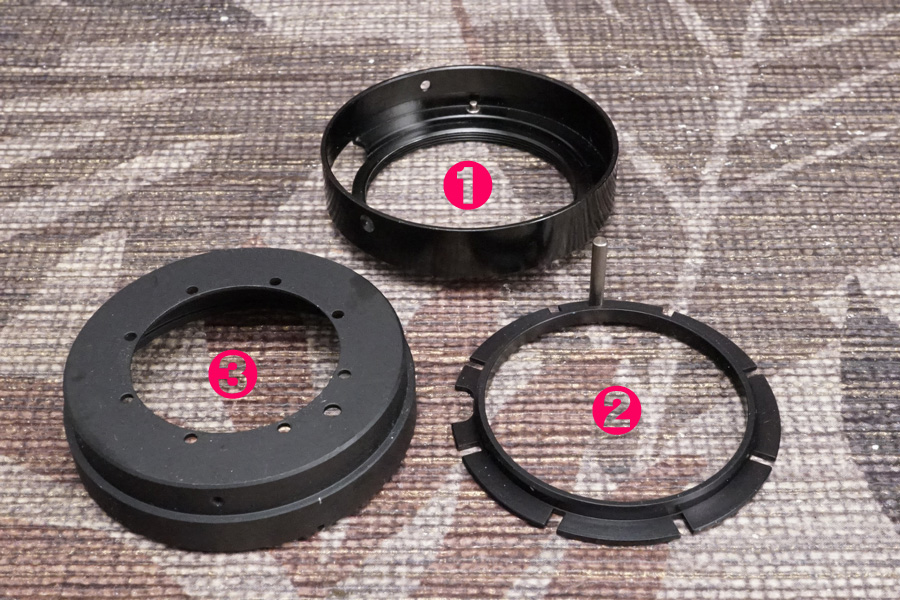 ↑上の写真は1962年に発売された「Super-Takumar 50mm f/1.4」モデルを扱った時のオーバーホール工程内の写真からの転載ですが、マウント部内部に組み込まれる構成パーツの一部を並べています。